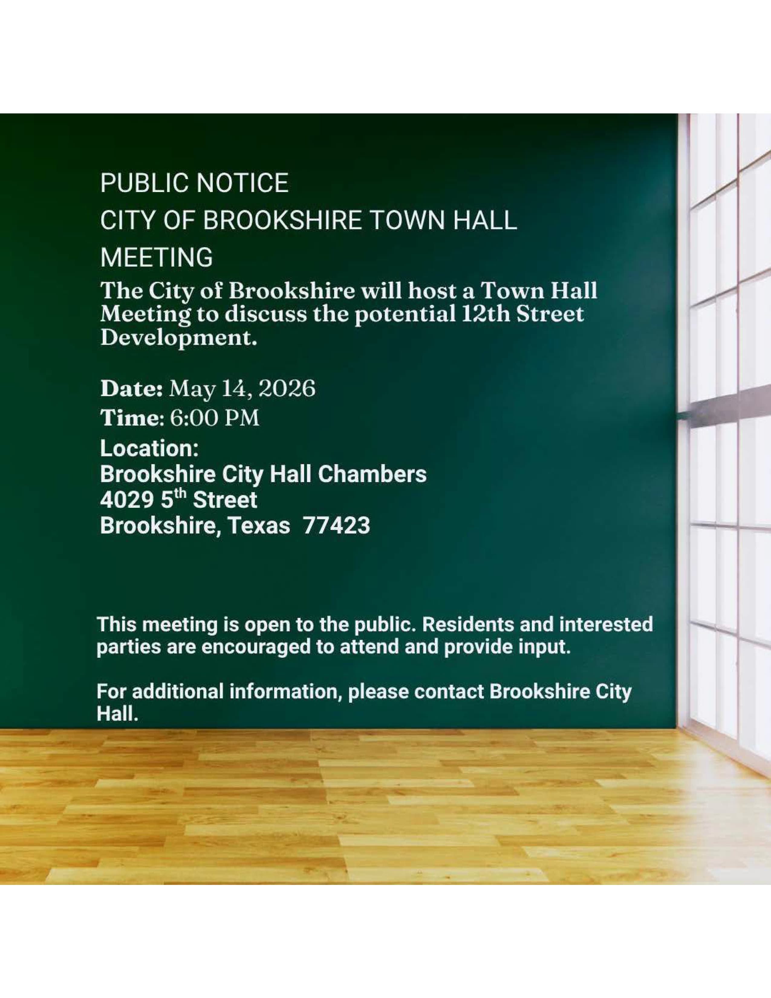 The city of Brookshire will host a Town Hall Meeting to discuss the potential 12th Street Development.