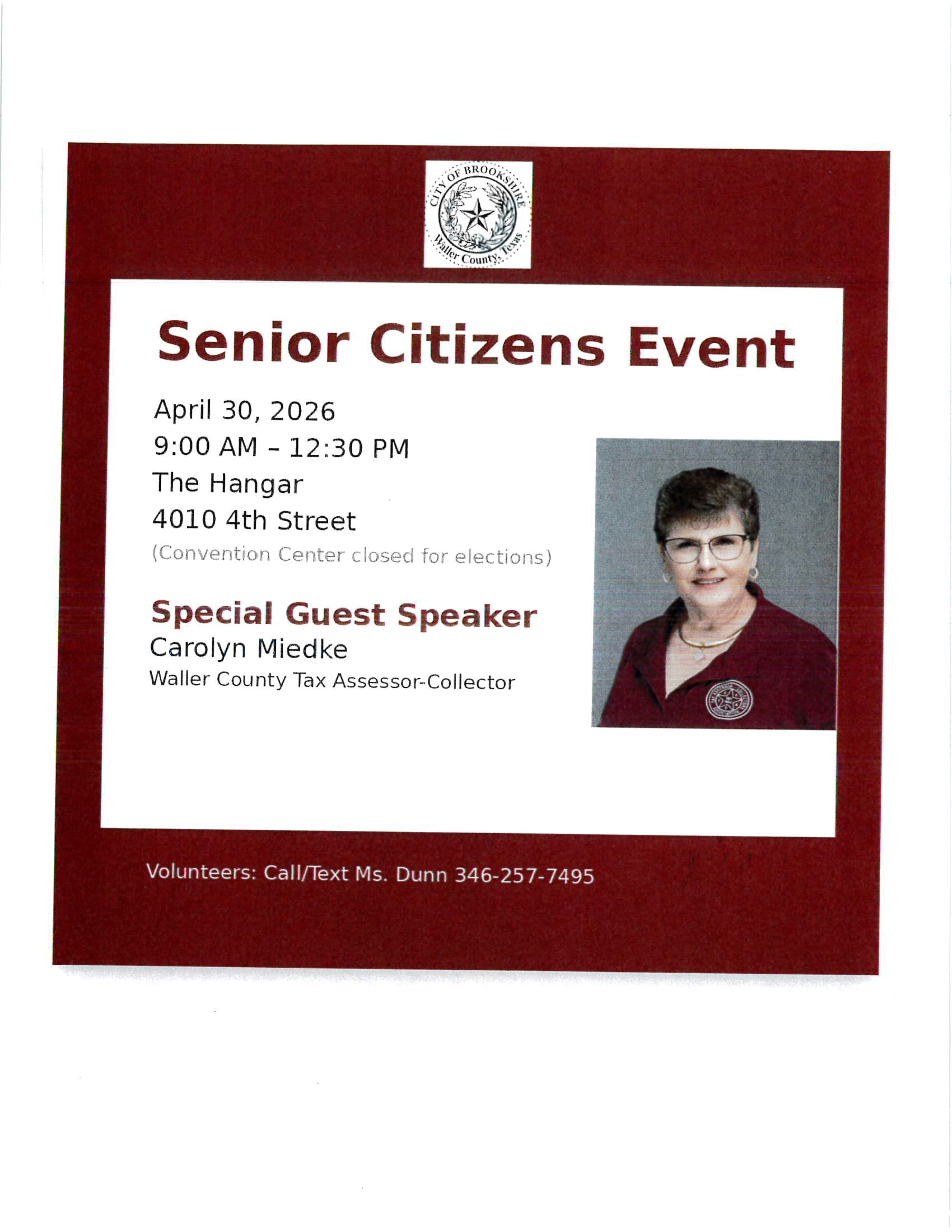 Notice is hereby given that the Youth Advisory Commission of the City of Brookshire, Texas, will hold a meeting on Wednesday, April 29th, 2026 at 5:30PM, at Brookshire Municipal Building.