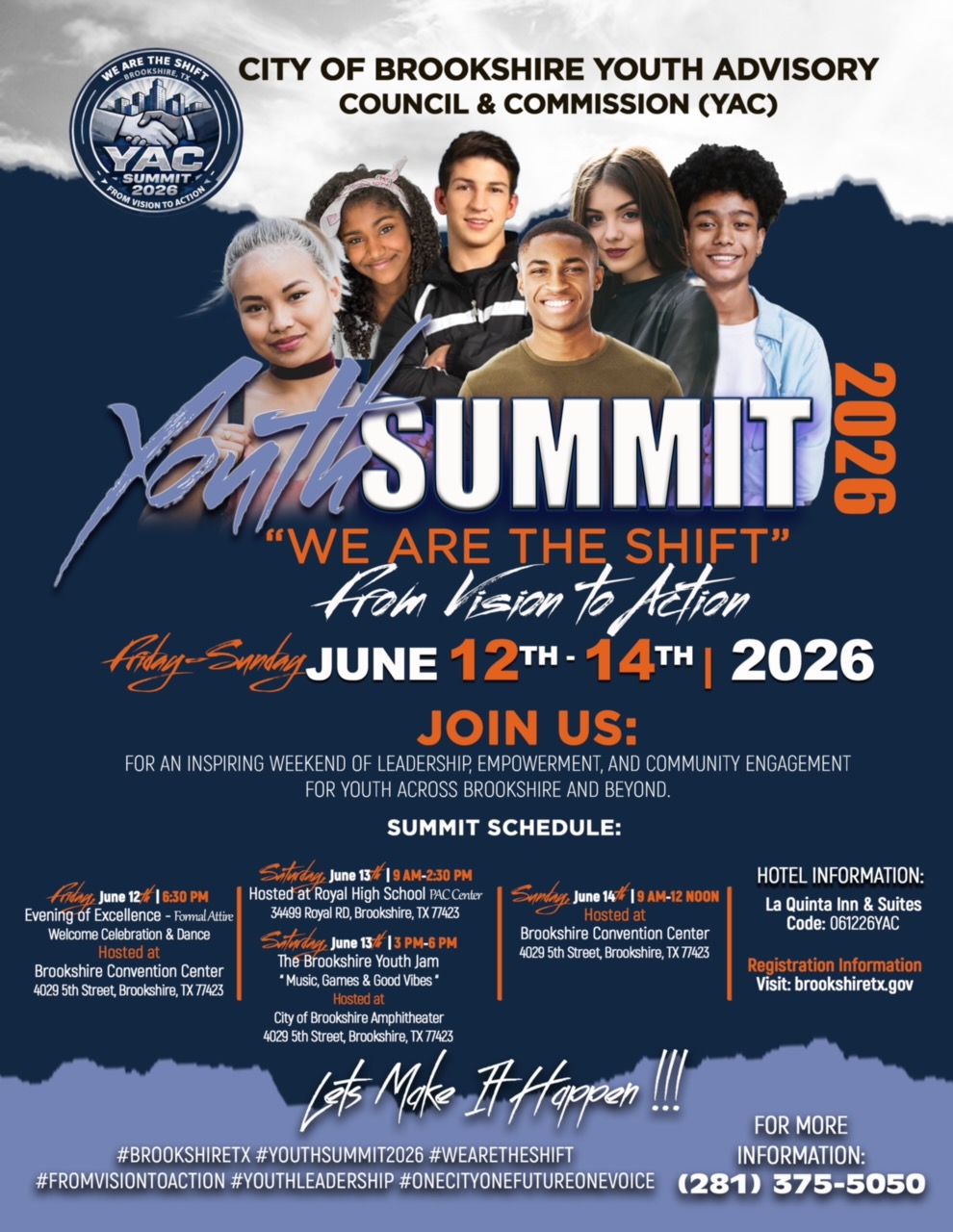 Notice is hereby given that the Youth Advisory Commission of the City of Brookshire, Texas, will hold a meeting on Wednesday, February 18th, 2026 at 5:30 PM, at Brookshire Municipal Building.